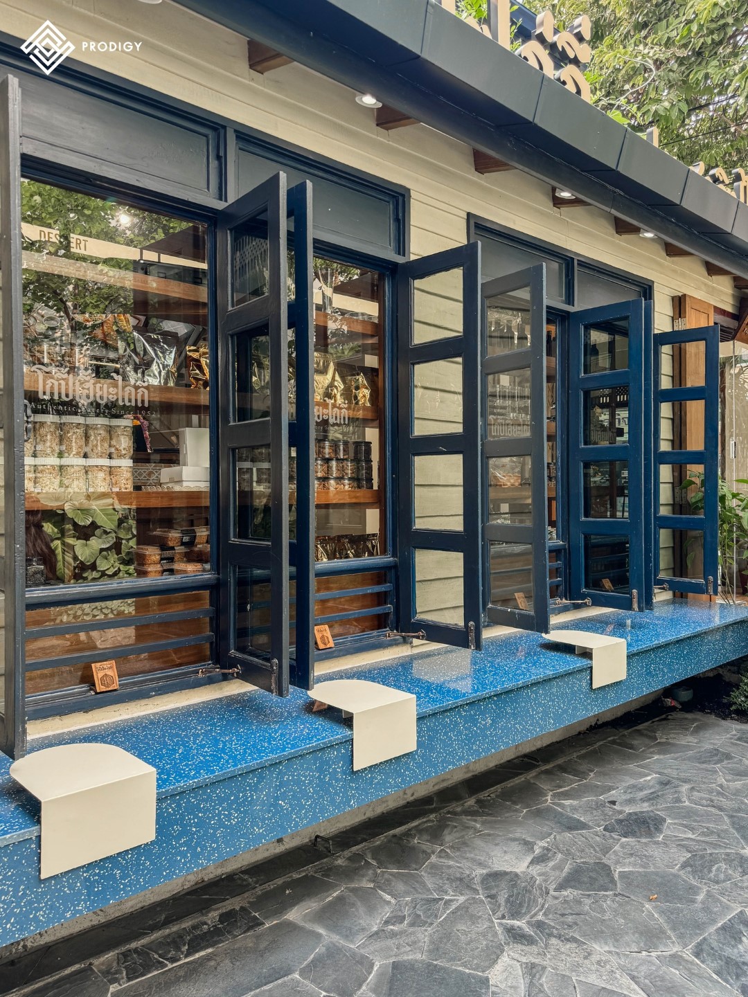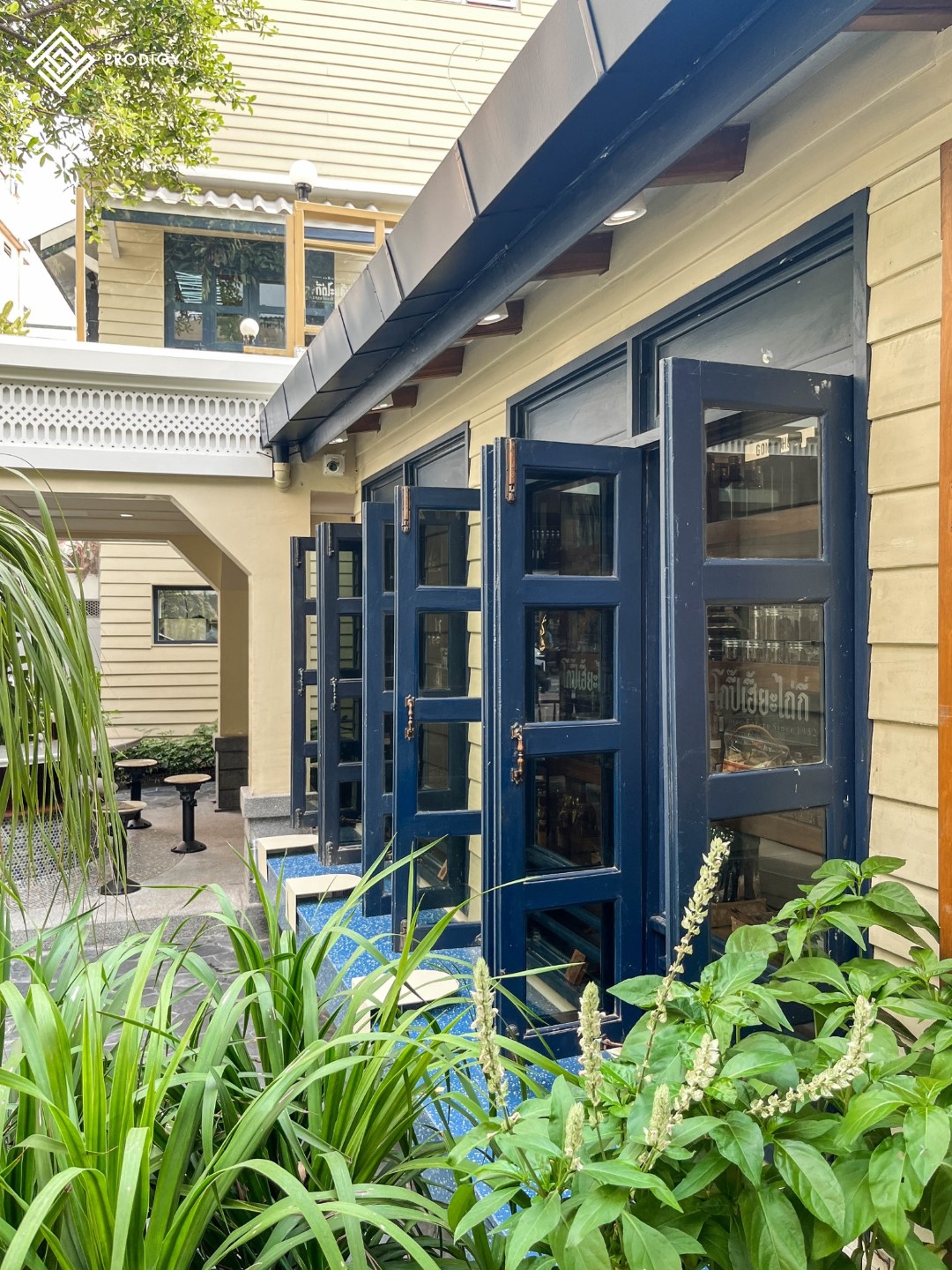 ด้วยสไตล์การแต่งร้านเป็นการผสมผสานที่ลงตัวระหว่าง วินเทจย้อนยุค ความเป็นไทย-จีน (สภากาแฟโบราณ) และความร่มรื่นแบบทรอปิคอล (Tropical) เป็นการสร้างบรรยากาศที่พาเราย้อนกลับไปในอดีตยุคกลางถึงยุคหลังของกรุงเทพฯ แต่ให้ความรู้สึกผ่อนคลายและสดชื่นเหมือนนั่งอยู่ในสวน “สีฟ้าคราม ของหินขัด Terrazzo” จึงกลมกลืนไปกับอารมณ์ของแบรนด์ที่ต้องการถ่ายทอดออกมา
