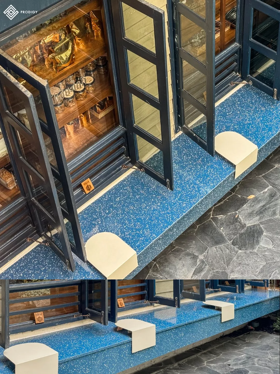 ที่นั่งหินขัด Terrazzo สีฟ้าครามสะดุดตา x โกปี๊เฮี้ยะไถ่กี่