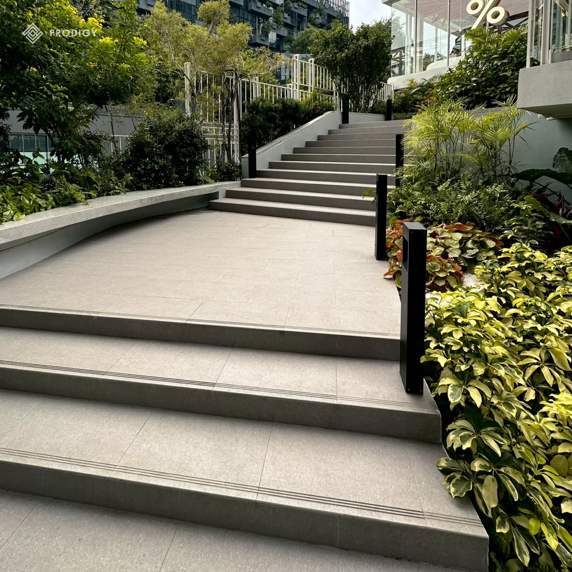 ลานกิจกรรมและพื้นที่พักผ่อนกลางแจ้งแห่งนี้ ถ่ายทอดแนวคิด Urban Oasis ผ่านกระเบื้องพอร์ซเลนรุ่น LIMESTONE ที่มาพร้อมผิวสัมผัสแบบ Matt และ Anti-slip ให้ความปลอดภัยทุกก้าวเดิน แม้ในพื้นที่เปียกหรือลาดเอียง ฟังก์ชันที่ซ่อนอยู่ภายใต้ดีไซน์ที่เรียบหรู โทนสี Light – Medium – Dark Grey ช่วยเสริมมิติให้กับพื้นผิวอย่างกลมกลืนกับภูมิทัศน์โดยรอบ พร้อมรองรับการใช้งานจริงในทุกวัน ไม่ว่าจะเป็นพื้นที่สำหรับจัดกิจกรรม นั่งพัก หรือเดินผ่าน ก็ยังคงให้ความรู้สึกสงบ เรียบง่าย และมั่นคง