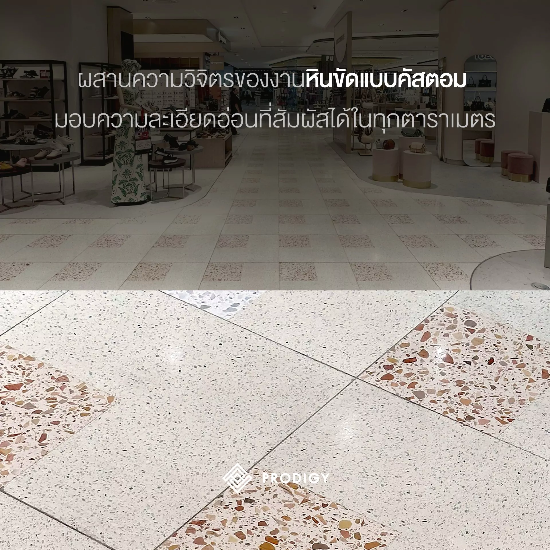 สิ่งที่ผมประทับใจมากในโครงการนี้คือการนำเสนอ “พื้นหินขัด Terrazzo สั่งตัดโดยเฉพาะ” เพราะ Prodigy Design ไม่ได้แค่ขาย “พื้นหินขัด” แต่เราขาย “ความเนี้ยบ” ครับ การคัดสรรเม็ดหินที่กระจายตัวอย่างสม่ำเสมอ ผสมผสานกับ “นวัตกรรมการตัดแบบ Cut-to-Size” ที่แม่นยำ ทำให้งานรอยต่อ (Joints) แทบจะมองไม่เห็น ซึ่งนี่คือหัวใจสำคัญที่สถาปนิกและเจ้าของโครงการระดับ High-end มองหา