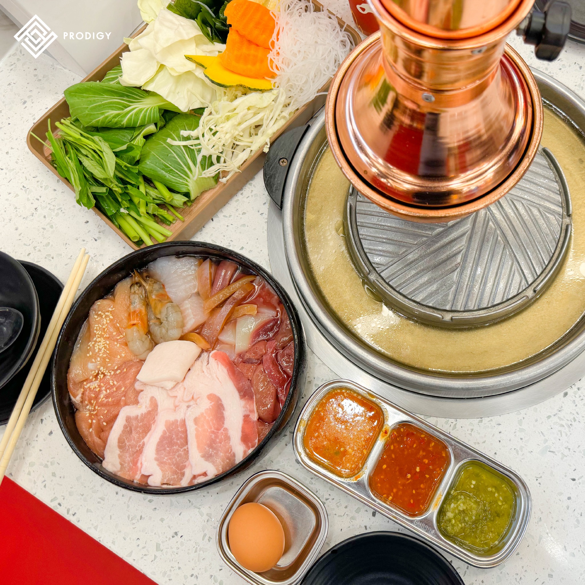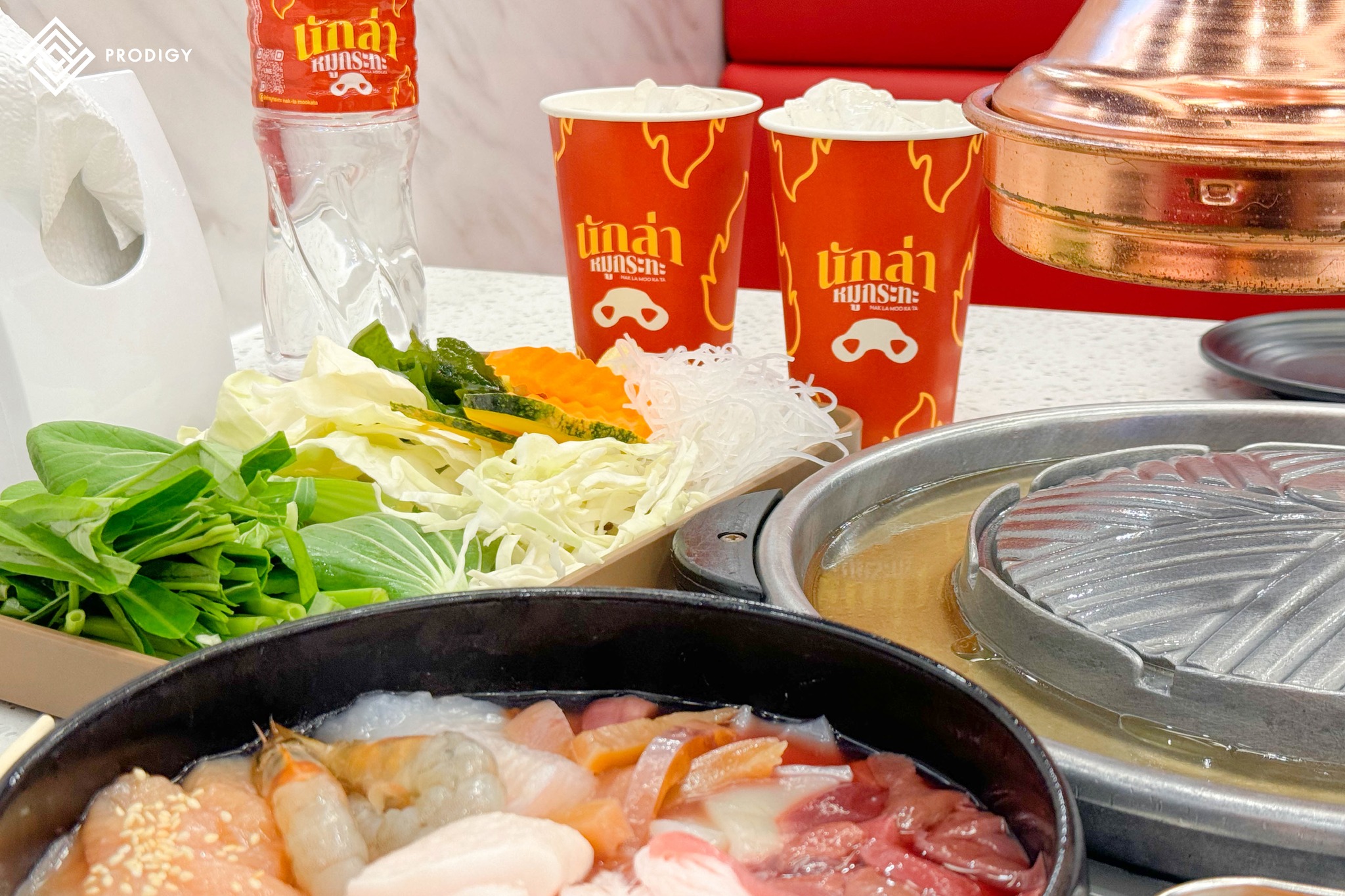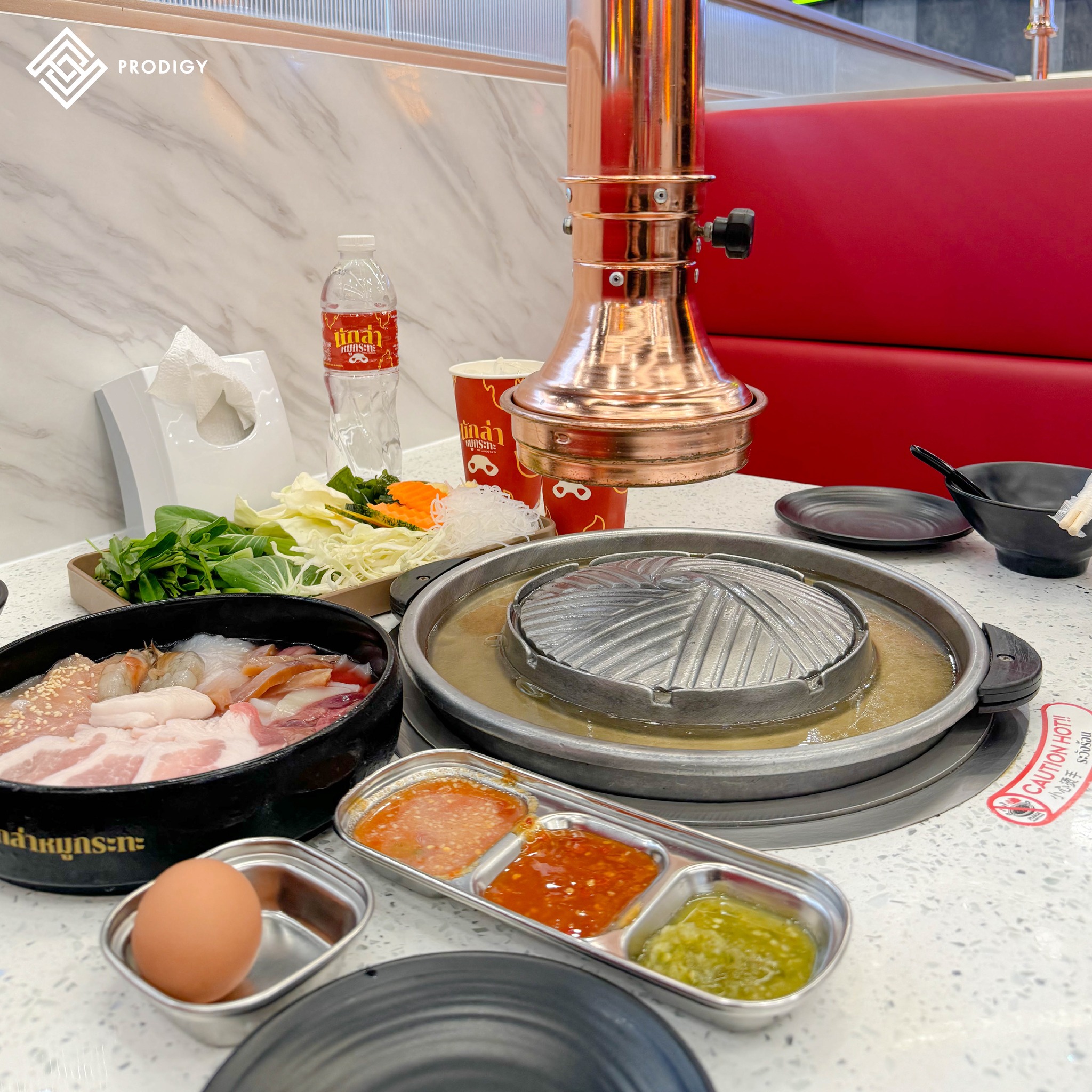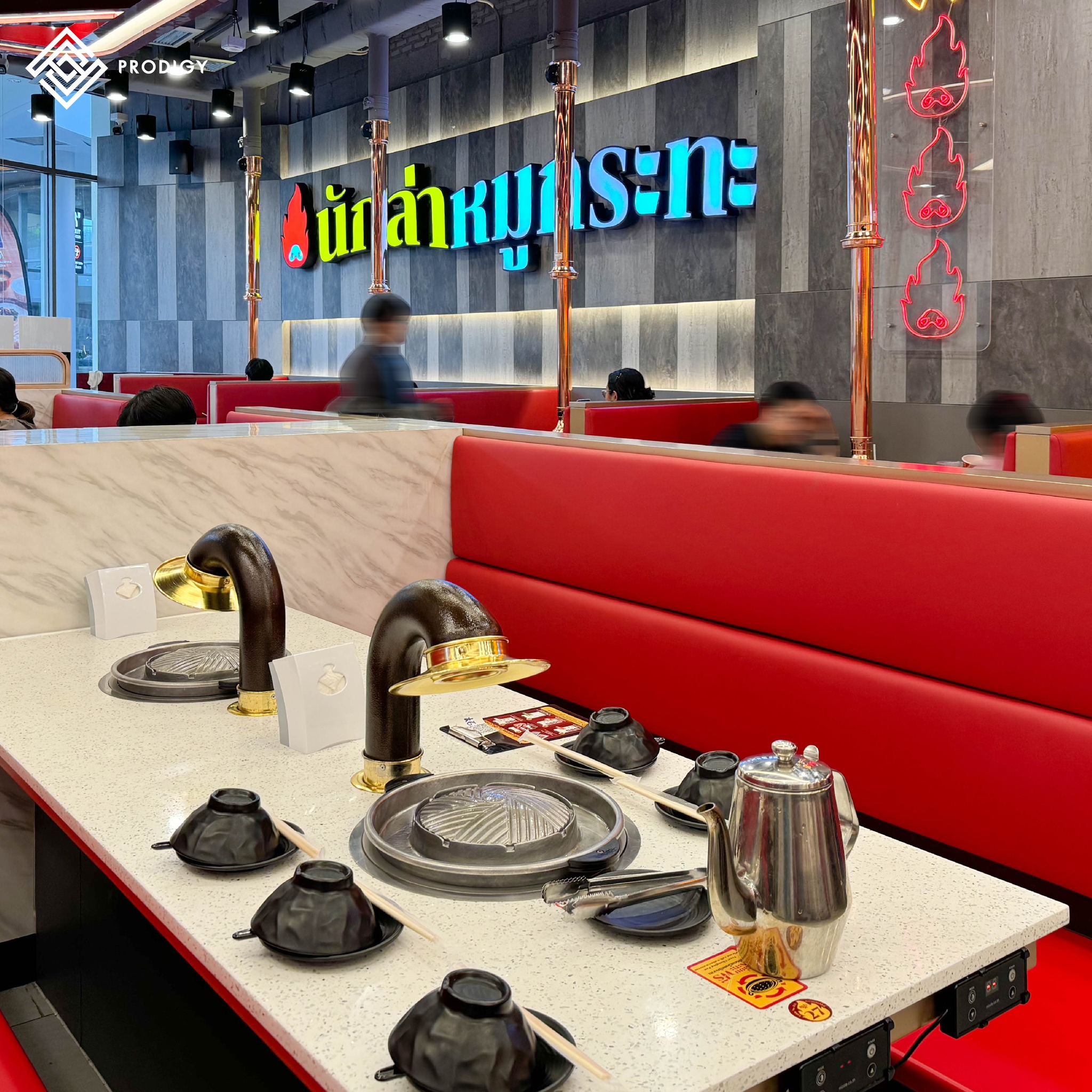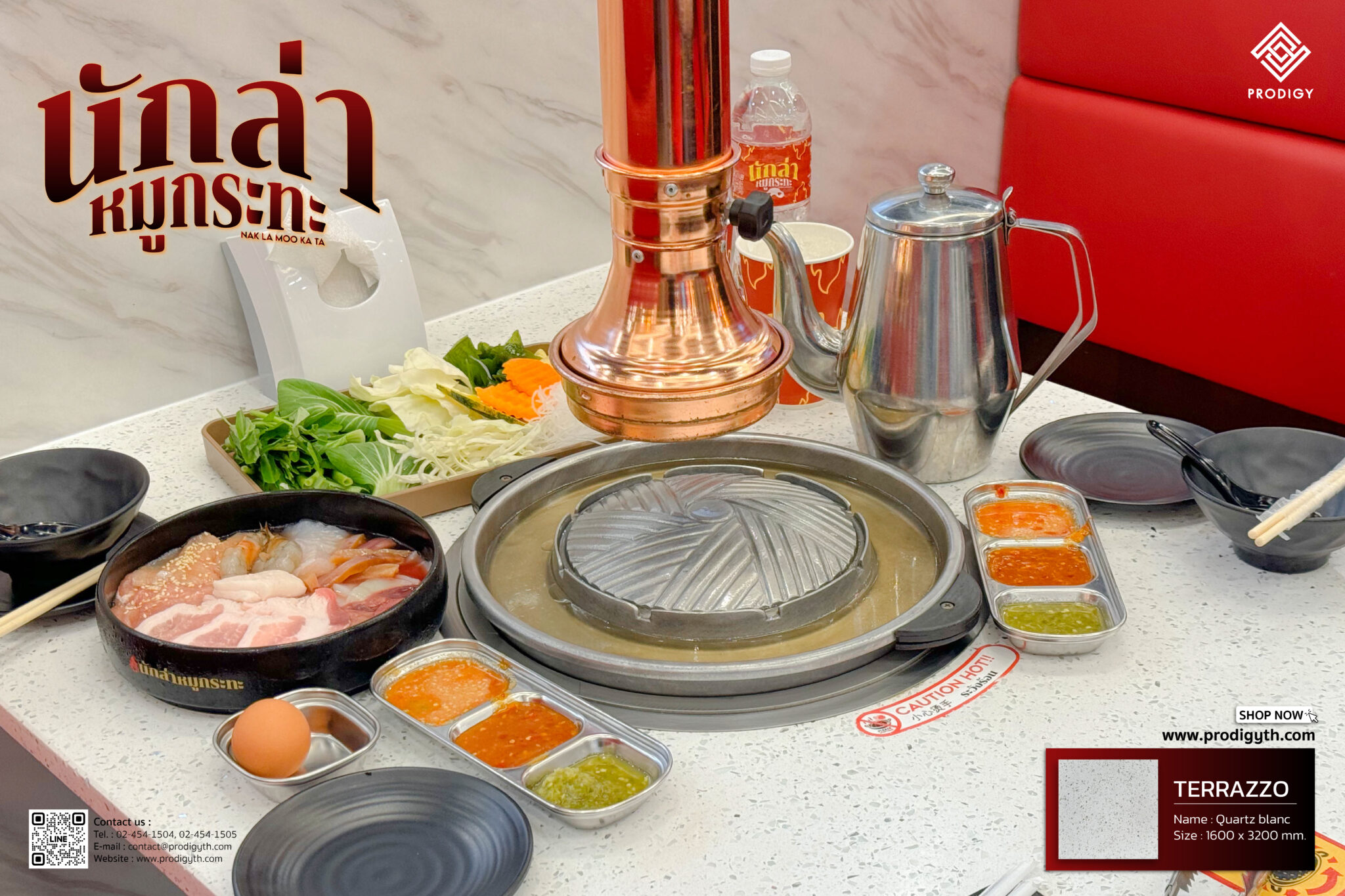 ทางร้านเลือกใช้สินค้าของทาง #โพรดิจี้ ที่นำไปใช้งานทำเป็นท็อปหน้าโต๊ะหมูกระทะด้วยหินเทียมเทอร์ราซโซลาย Quartz blanc (PD-Q001) ตัวพื้นหินเป็นสีขาวปนด้วยวัสดุประเภทเกล็ดหินคุณสมบัติสะท้อนแสง กระจายอยู่บนแผ่นหิน ด้วยคุณสมบัติของหินควอตซ์ที่มีความแข็งแกร่ง ทำให้สามารถใช้งานกับเตากระทะร้อนได้เป็นอย่างดีที่มาพร้อมกับคุณสมบัติที่ไม่ดูดซึมคราบ จึงทำให้ควอตซ์สามารถใช้งานกับพื้นที่รับประทานอาหารได้อย่างสะดวก อีกทั้งความขาวสะอาดของควอตซ์ยังช่วยให้ชามอาหารบนโต๊ะดูโดดเด่น น่ารับประทาน และสร้างบรรยากาศที่ดีกับมู้ดโทนสีแดงของร้านได้อย่างลงตัว