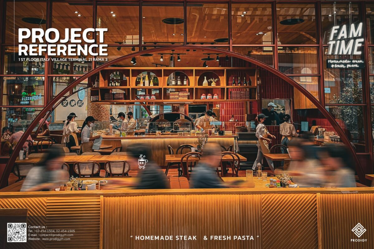 ร้านอาหารสไตล์อิตาลี ที่มีพาสต้าเส้นสด พิซซ่าโฮมเมดแสนอร่อย โดยเฉพาะเมนูพิซซ่าทรัฟเฟิลที่ครองใจใครหลายๆ คน FAM TIME มีสาขาที่สยามสแควร์ และได้ขยายสาขาสู่ Terminal21 พระราม 3 เป็นที่เรียบร้อย การออกแบบร้านตกแต่งด้วยสไตล์ทัสคานี่ โดยเลือกใช้สีส้มอิฐเป็นสีหลักในการตกแต่งร้าน และเน้นความโค้งมนโดยเฉพาะประตูที่โค้งรับกับเคาน์เตอร์ด้านใน เพื่อเปิดให้เห็นบรรยากาศการทำพิซซ่าโฮมเมด และเส้นพาสต้ากันแบบสดๆ นอกจากนี้ทางร้านยังเลือกใช้หินเทียมเทอร์ราซโซ ลาย Marron de luxe (PD-T014) โทนสีส้มจากโพรดิจี้ ดีไซน์เป็นท็อปเคาน์เตอร์โค้งสุดอลัง ที่รับกับความโค้งของประตูอย่างลงตัว