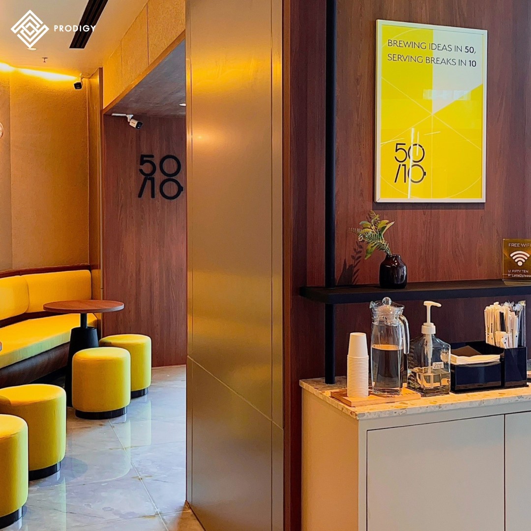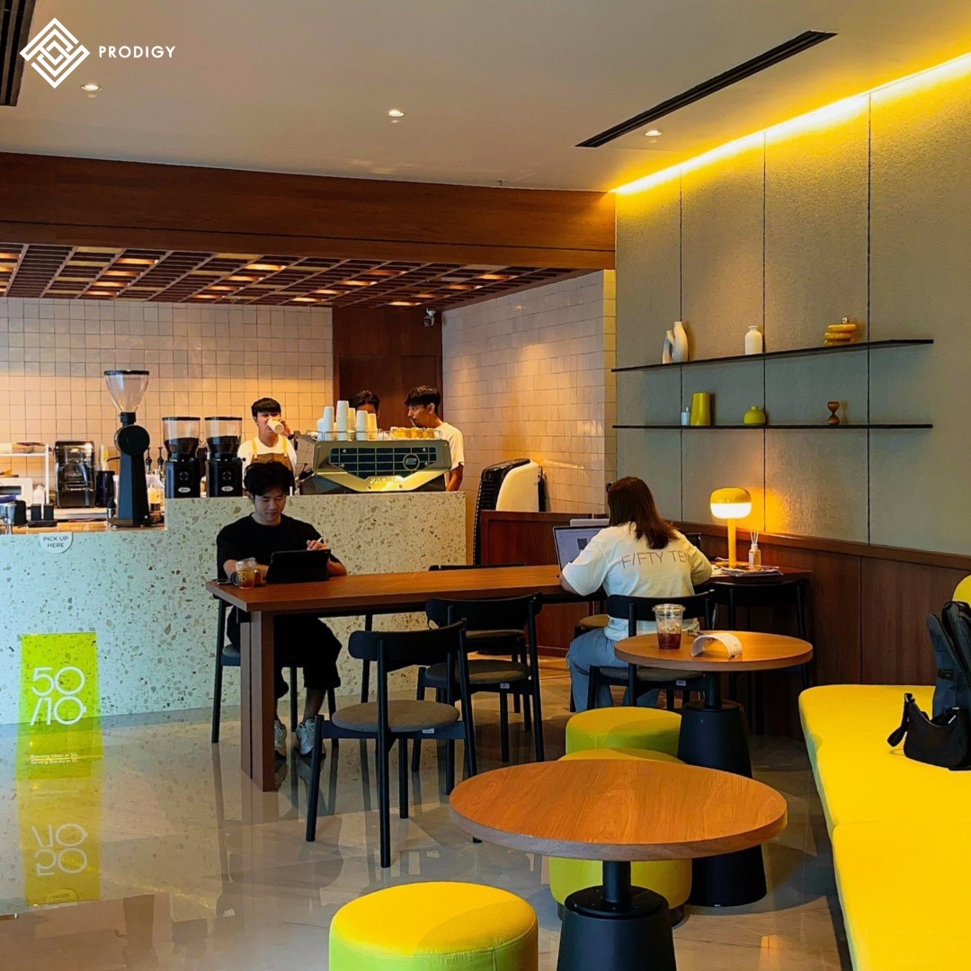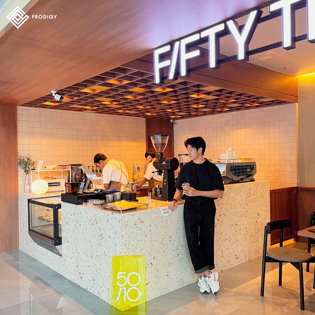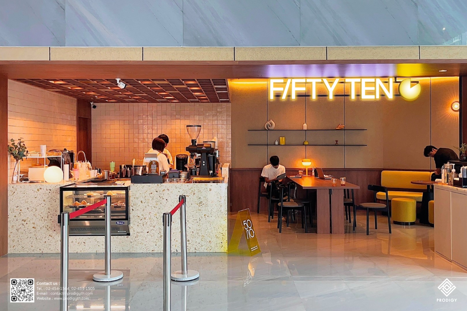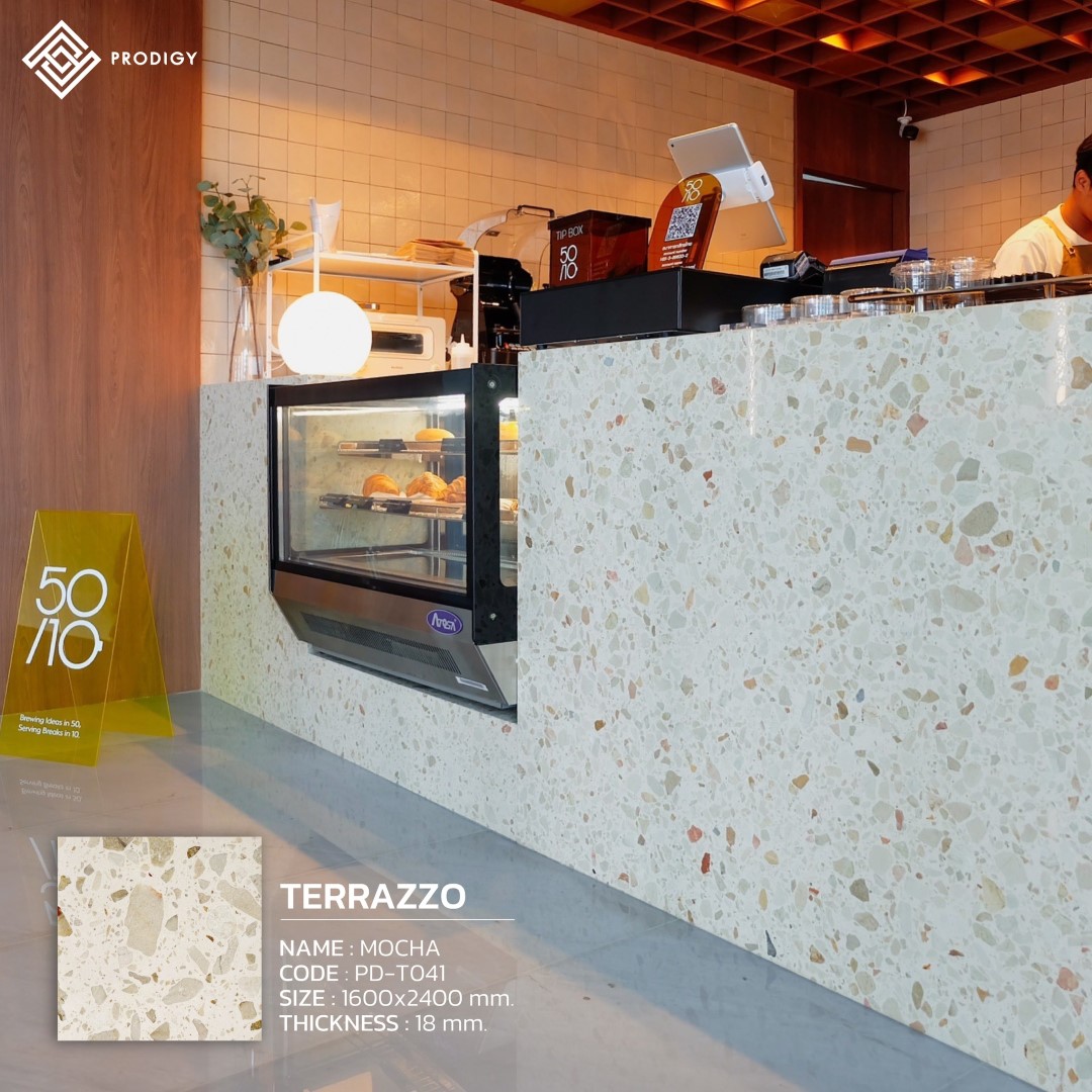 “FIFTYTEN” คาเฟ่ในตึกสาทร ไพรม์ ภายในร้านออกแบบให้มีบรรยากาศ cozy space เหมาะแก่การพบปะพูดคุยสำหรับการค้นหาไอเดียใหม่ๆ ในการเรียนหรือการทำงาน และเป็นพื้นที่พักผ่อนที่ดีในแต่ละวัน ภายใต้แนวคิด 50/10 ที่มีความหมายว่า Brewing Ideas in 50 and Serving Breaks in 10 โดยทางร้านเลือกใช้หินเทียมเทอร์ราซโซลาย Mocha (PD-T041) ของโพรดิจี้ ดีไซน์ ในการทำท็อปเคาน์เตอร์ ด้วยลวดลายของหินเทียมสีน้ำตาลครีมจึงเข้าชุดกันได้ดีกับเครื่องชงกาแฟและโทนสีของไม้และเฟอร์นิเจอร์สีเหลือง รวมถึงการตกกระทบของแสงไฟยังช่วยให้ลายหินดูเด่นและเป็นเอกลักษณ์มากยิ่งขึ้น