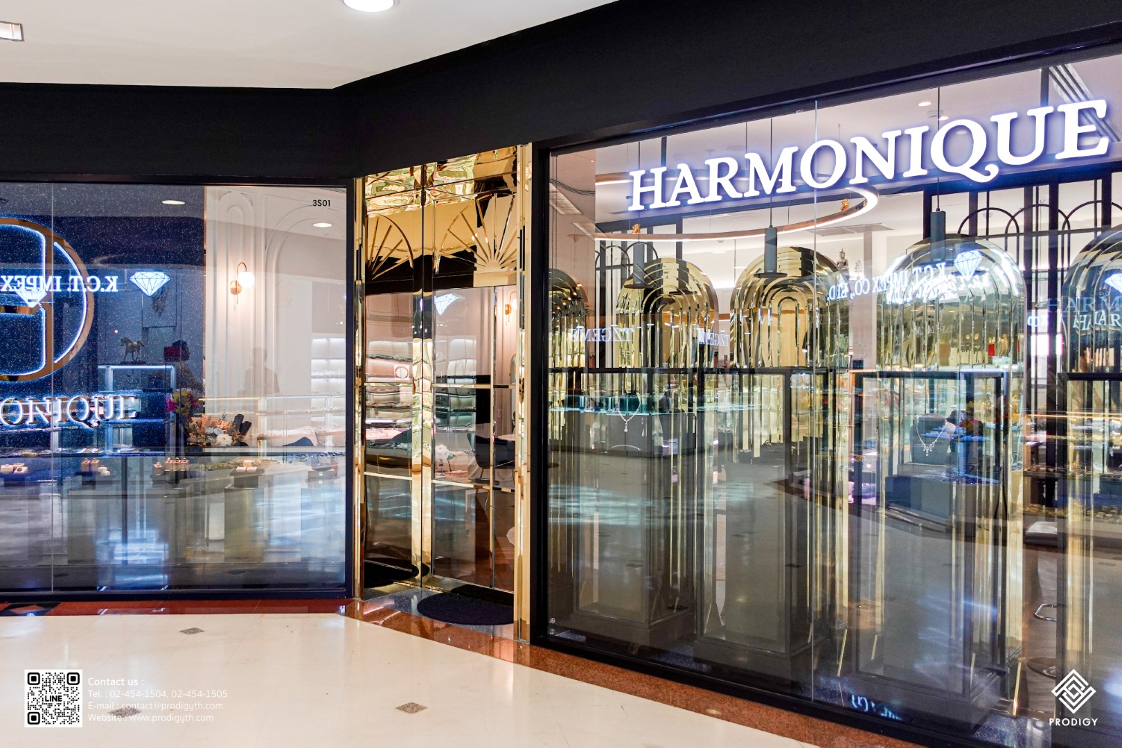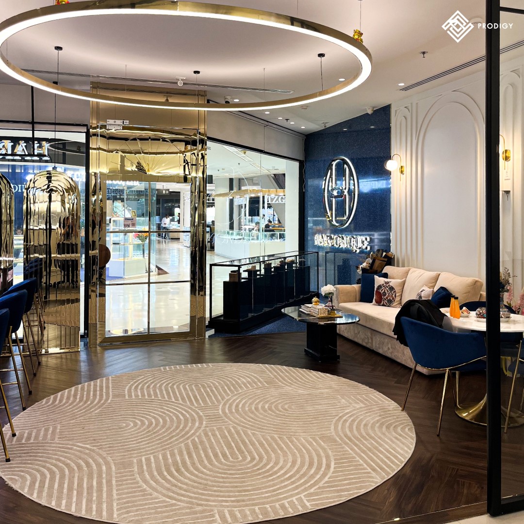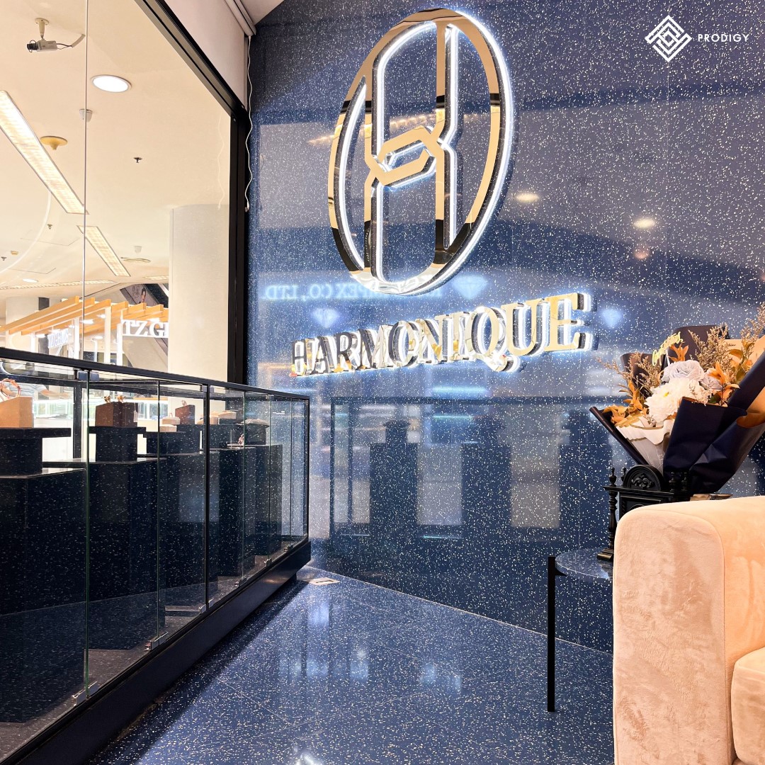 “Harmonique Jewelry” ร้านจิวเวลรีที่มีเอกลักษณ์เฉพาะภายใต้คอนเซ็ปต์ Harmony + Unique สื่อถึงความเป็นเอกลักษณ์ที่สอดประสานด้วยเรื่องราว สะท้อนผ่านงานออกแบบแหวนและเครื่องประดับเพื่อให้ลูกค้าได้รับประสบการณ์ที่ดีและมีความสุข ภายในร้านตกแต่งสไตล์โมเดิร์นแปลกตาและแฝงด้วยความทันสมัยที่เป็นเอกลักษณ์ไม่เหมือนใคร โดยทางร้านเลือกใช้หินเทียมเทอร์ราซโซลาย Marioni Blue (PD-T076) ของโพรดิจี้ ดีไซน์ ด้วยโทนสีฟ้าสำหรับติดตั้งในส่วนของงานพื้นและผนังบริเวณหน้าร้าน ช่วยเพิ่มความโดดเด่นสะดุดตาและช่วยสร้างความหรูหรามีระดับให้กับร้านได้เป็นอย่างดี