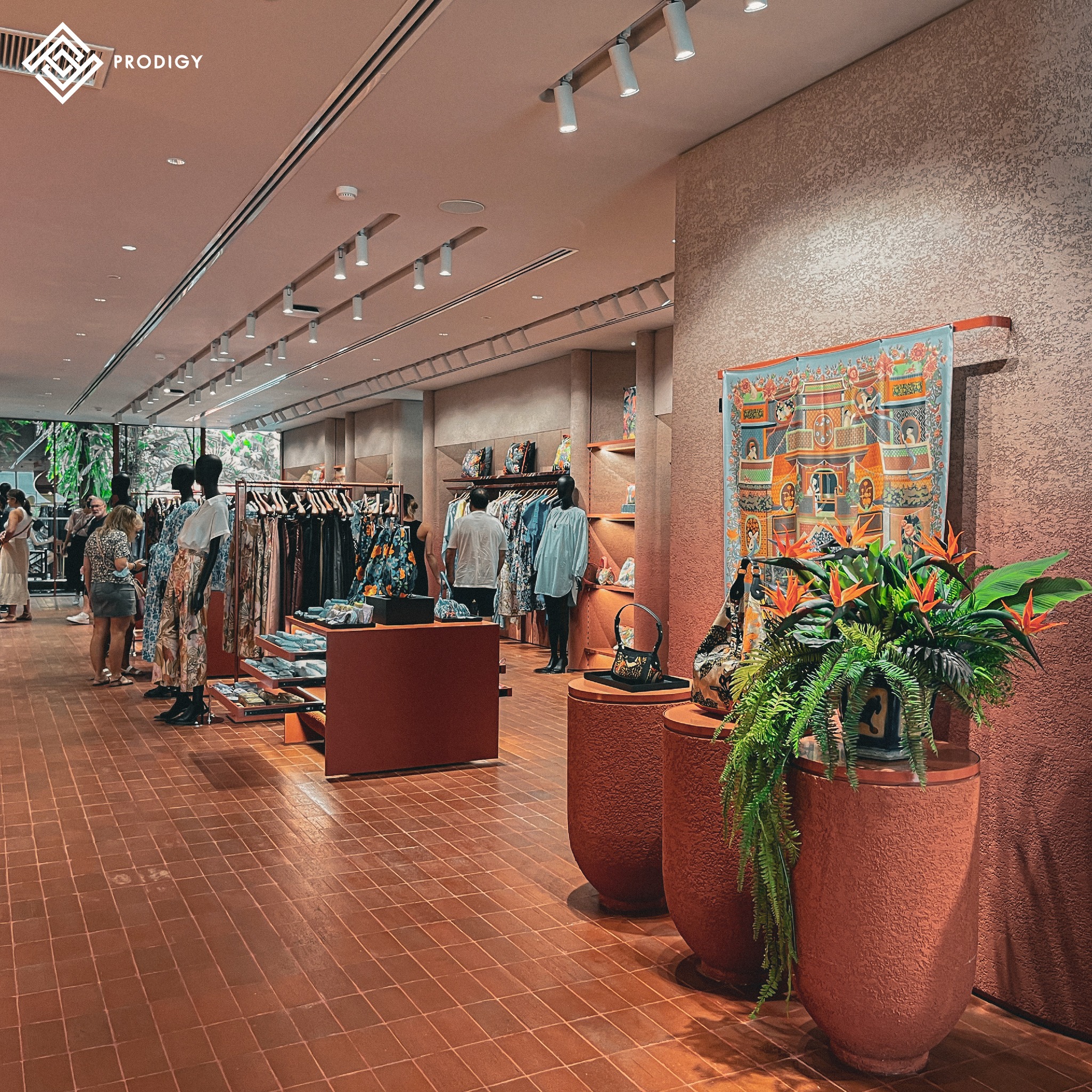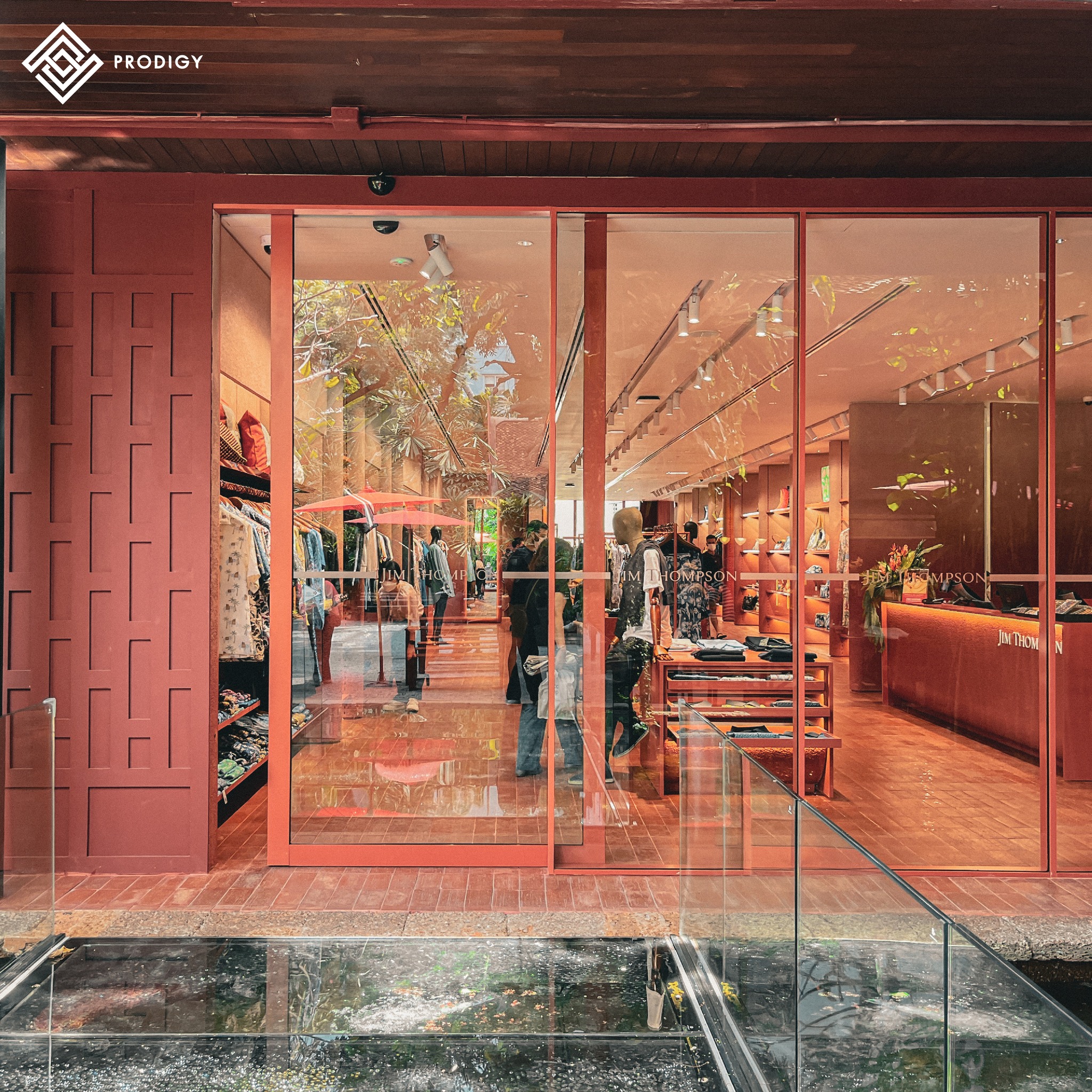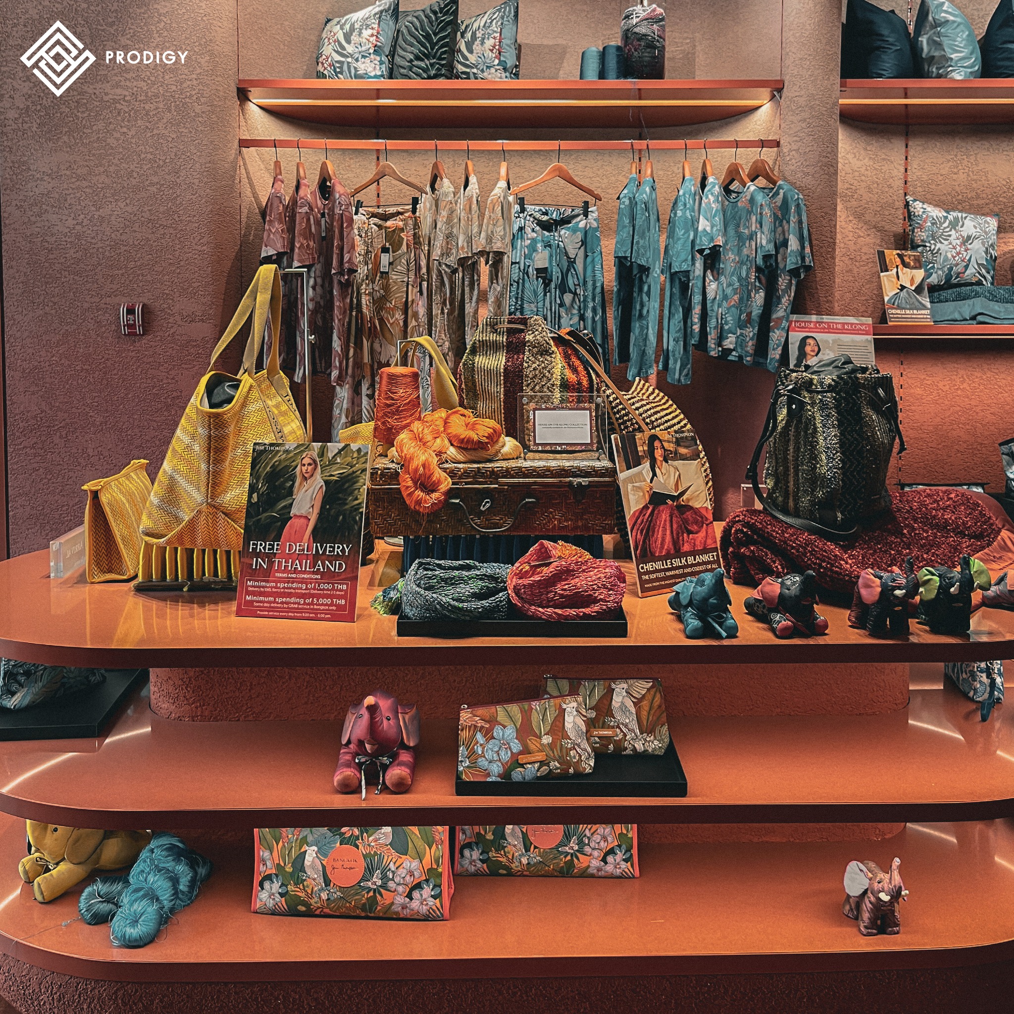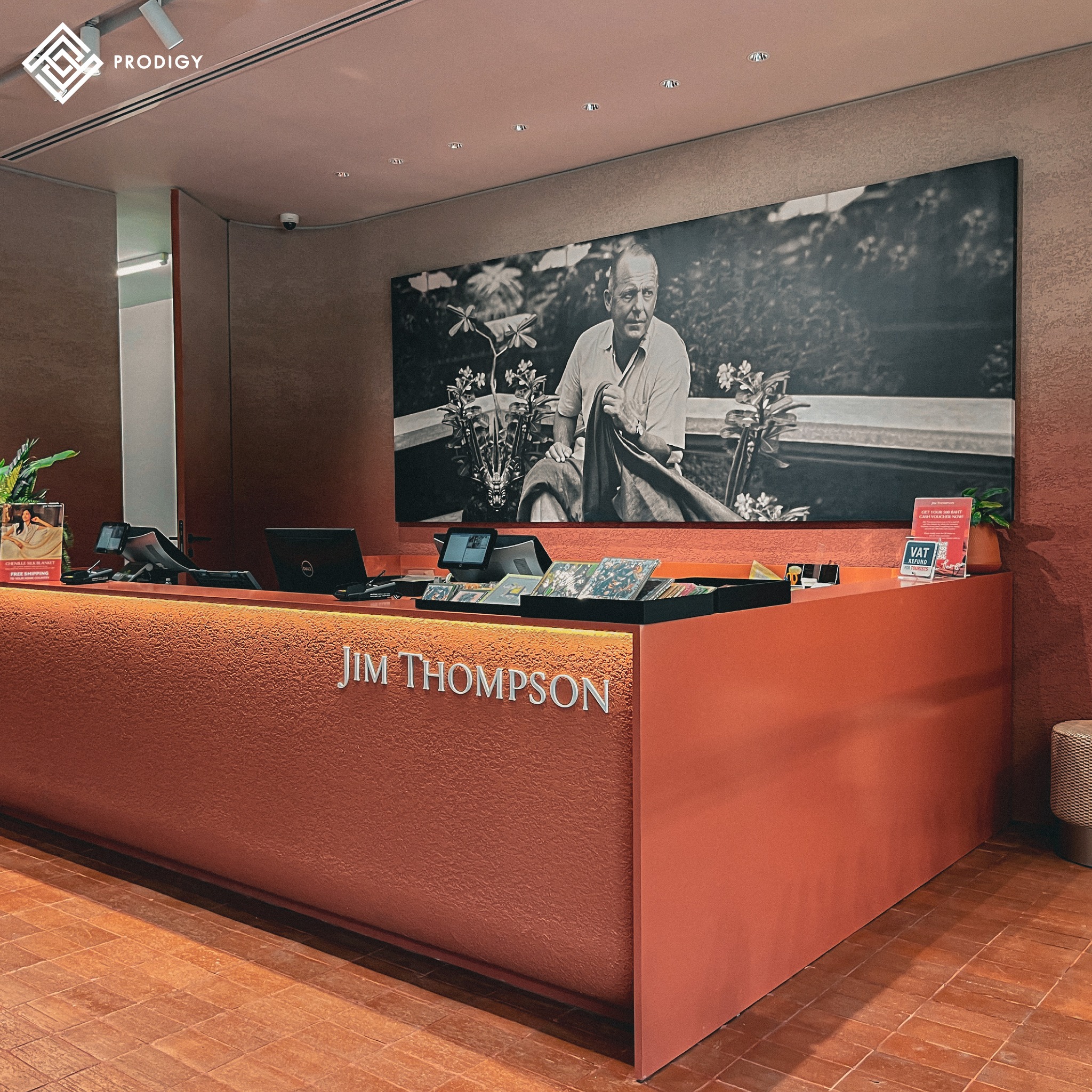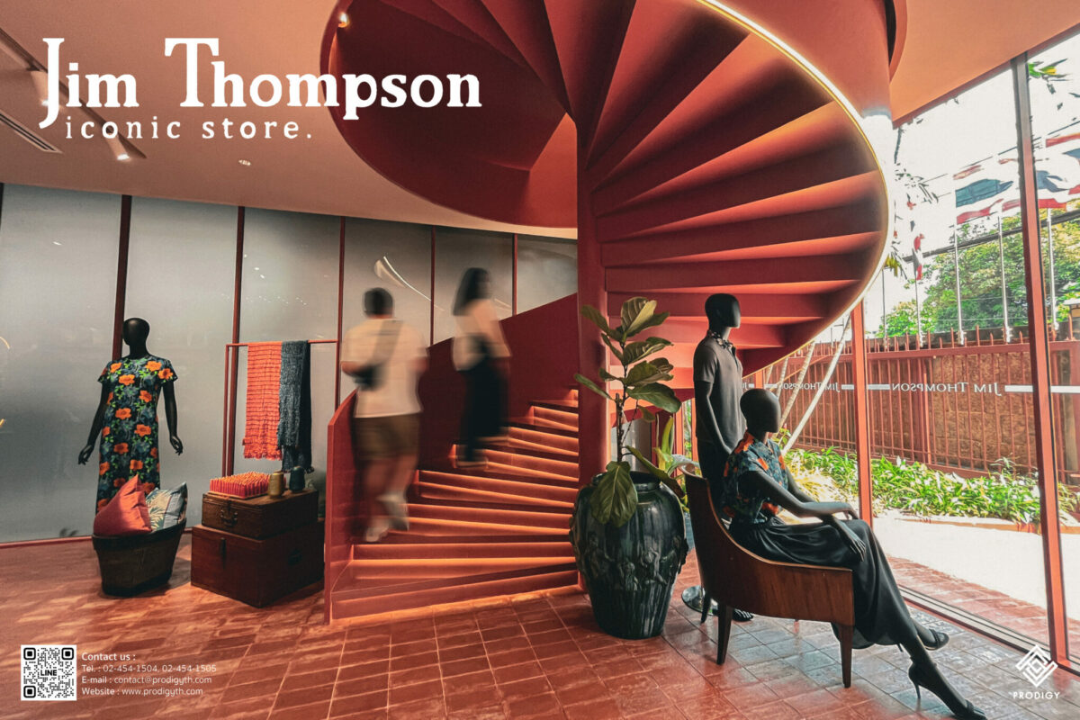 พื้นที่จัดแสดงวิวัฒนาการสิ่งทอของ Jim Thompson ที่เผยเรื่องราวให้เห็นถึงความเป็นมาของอุสาหกรรมผ้าไหมไทย Jim Thompson ได้พลิกโฉมสร้างบรรยากาศในโซน Retail shop ที่ได้รับแรงบันดาลใจจากโทนสีแดงของเรือนไทย รวมถึงการนำลายไทยและความสวยงามของผ้าไหมไทยมาเป็นส่วนหนึ่งของการตกแต่งตัวอาคารที่ตั้งอยู่บริเวณซ้ายมือของทางเข้า มี 2 ชั้นเชื่อมต่อกันด้วยบันไดวน ที่ตกแต่งด้วยหินสังเคราะห์ Ecological stone สีส้มพิเศษจากโพรดิจี้ ดีไซน์ เพื่อให้เข้ากับโทนสีของร้าน นอกจากนี้ยังมีโซนจัดแสดงสินค้าชั้น 1 ที่เลือกใช้หินสังเคราะห์ Ecological stone ทำเป็นท็อปเคาน์เตอร์ ชวนให้ถ่ายรูป และเพลิดเพลินกับการช็อปปิ้งสินค้ามากกว่า 5,000 รายการ ที่คัดสรรคมากจากผีมือคนไทย