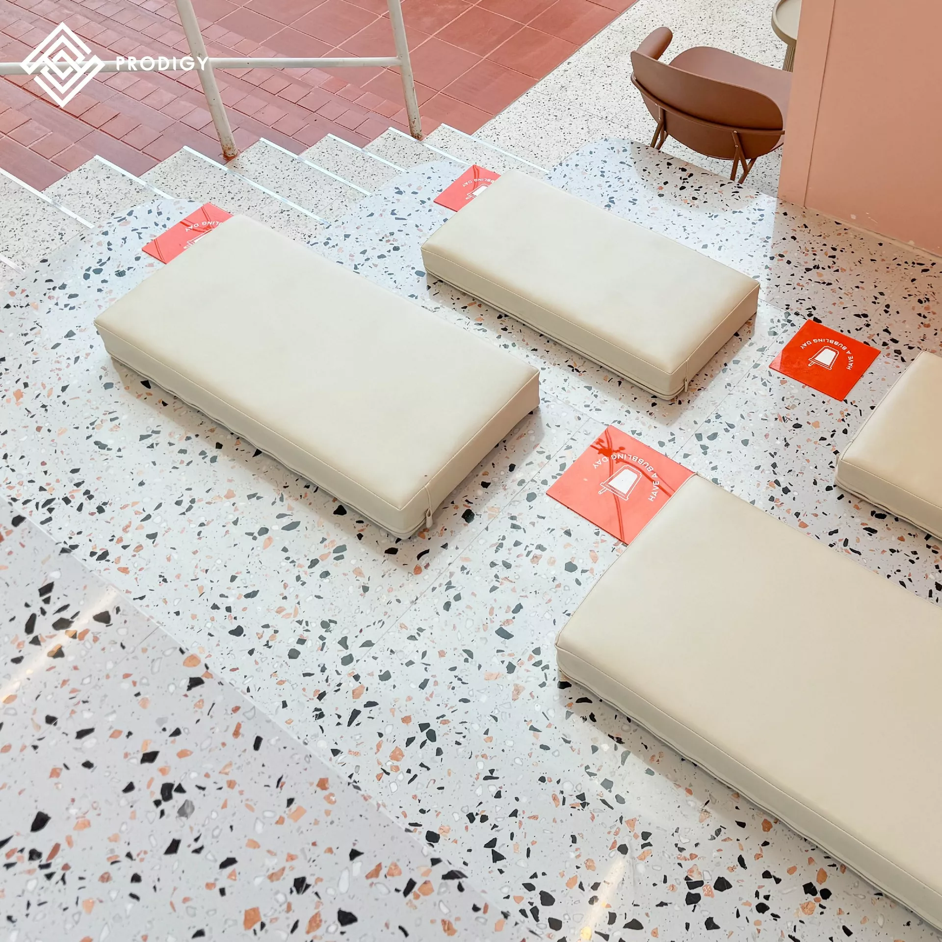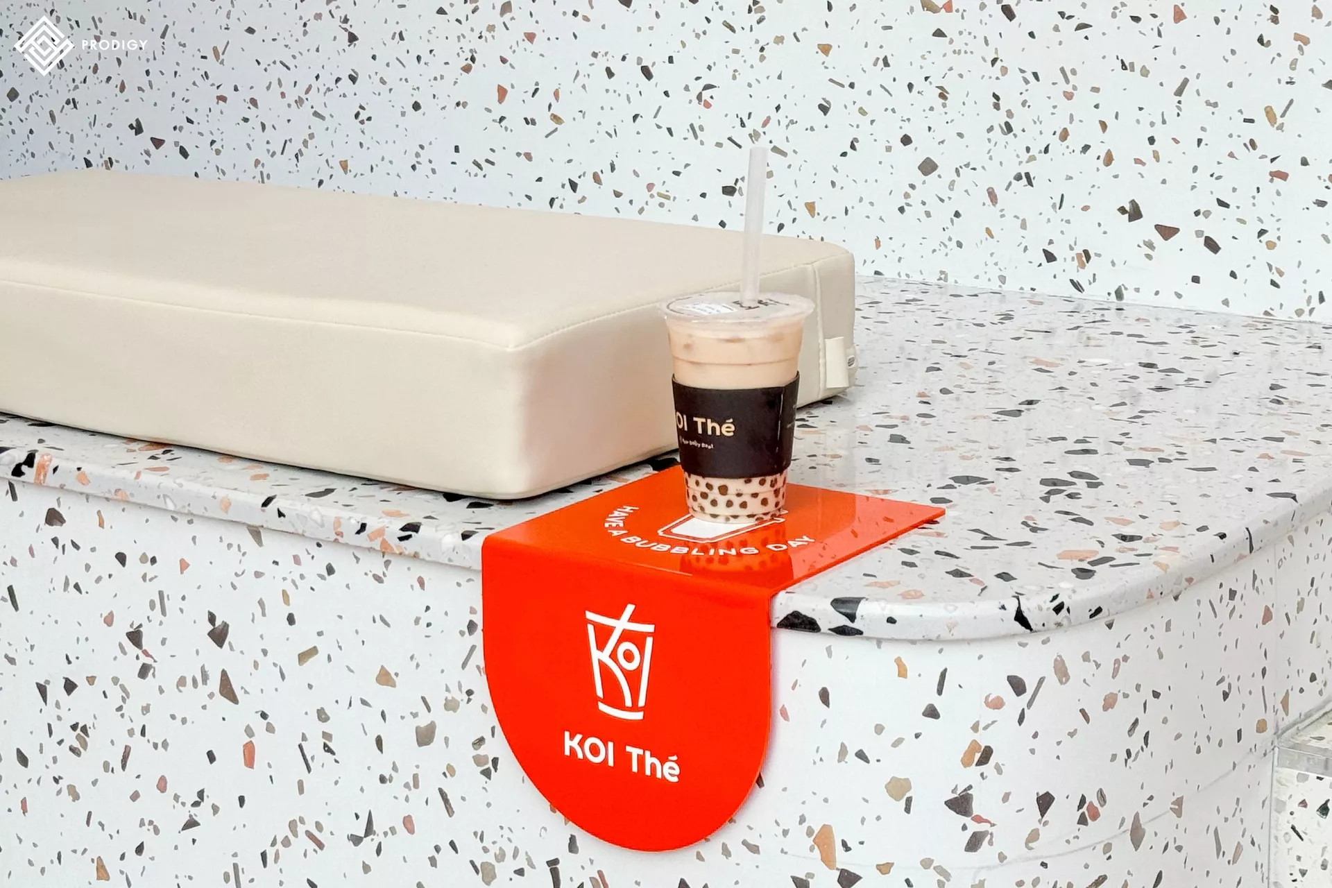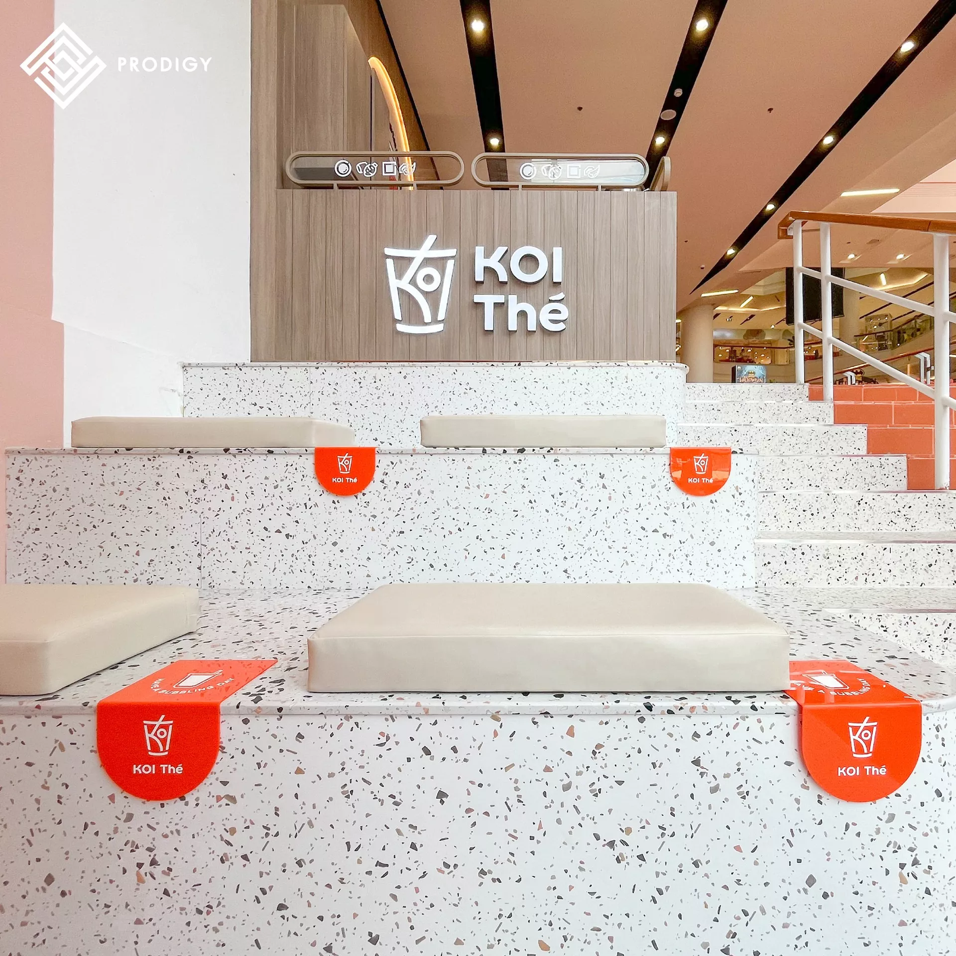 ร้านชานมไต้หวันแบรนด์โคอิเตะ (KOI Thé) สาขาเซ็นทรัลแจ้งวัฒนะกับการใช้งานหินเทียมเทอร์ราซโซเพื่อการออกแบบพื้นที่นั่งระนาบเดียวกับบันได ความพิเศษของการออกแบบร้านชานมนี้คือ การออกแบบพื้นที่นั่งให้เข้ากับรรยากาศของร้านและบรรยากาศของห้างที่มาในโทนสีส้ม สร้างความเป็นเอกลักษณ์และน่าดึงดูด