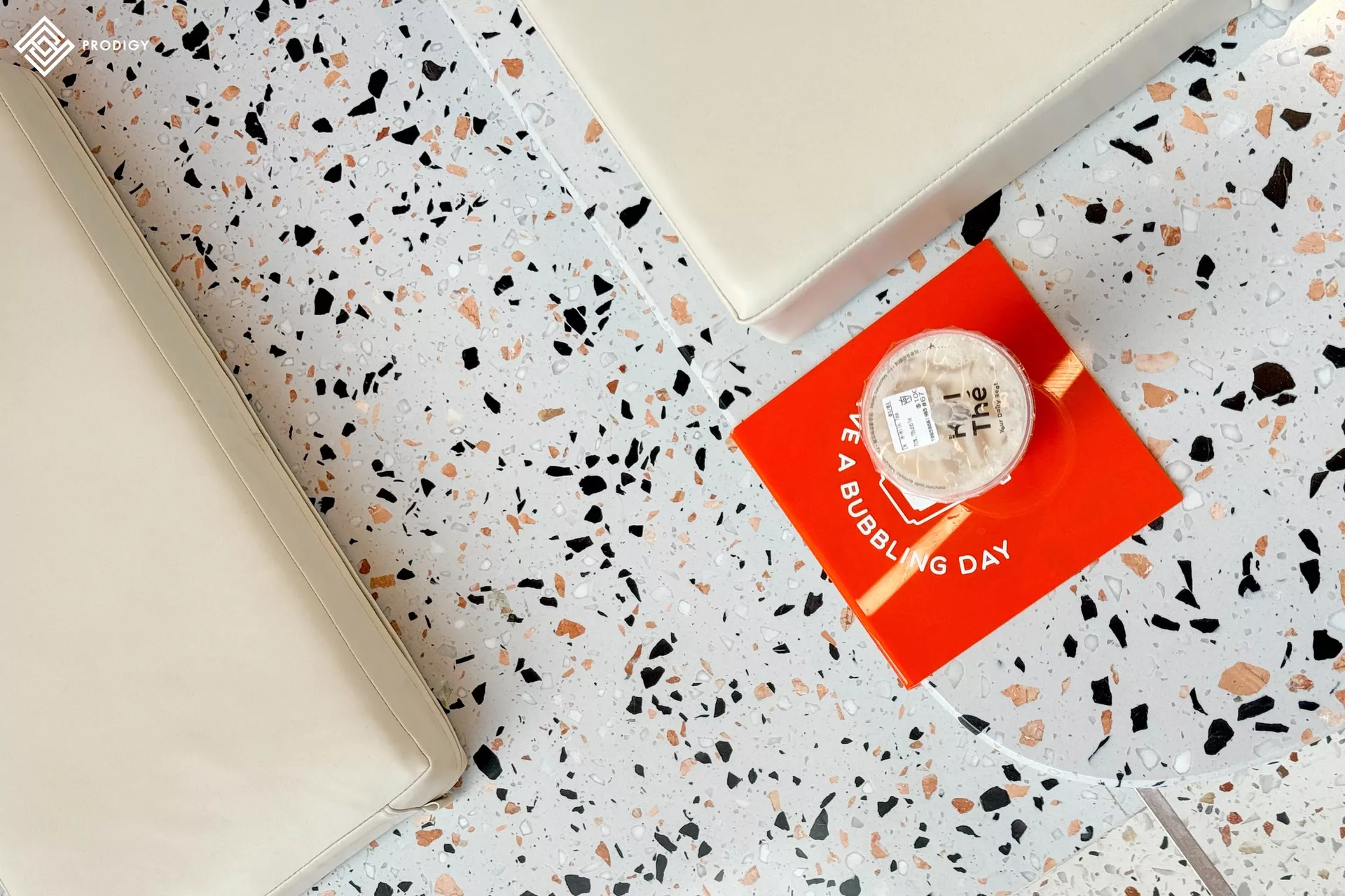 ตัวเลือกวัสดุที่ตอบโจทย์ทั้ง Design และ Function Utility ต้องยกให้กับ “หินขัด Terrazzo ลาย Tangerine PD-T012” ที่ตัวพื้นหินเป็นสีขาว ปนด้วยเกล็ดหินสีน้ำตาลส้ม ดำ ขาว กระจายอยู่บนแผ่นหินเพิ่มลูกเล่นให้บรรยากาศภายในร้านมีความน่ารัก สดใส และลงตัวมากที่สุด