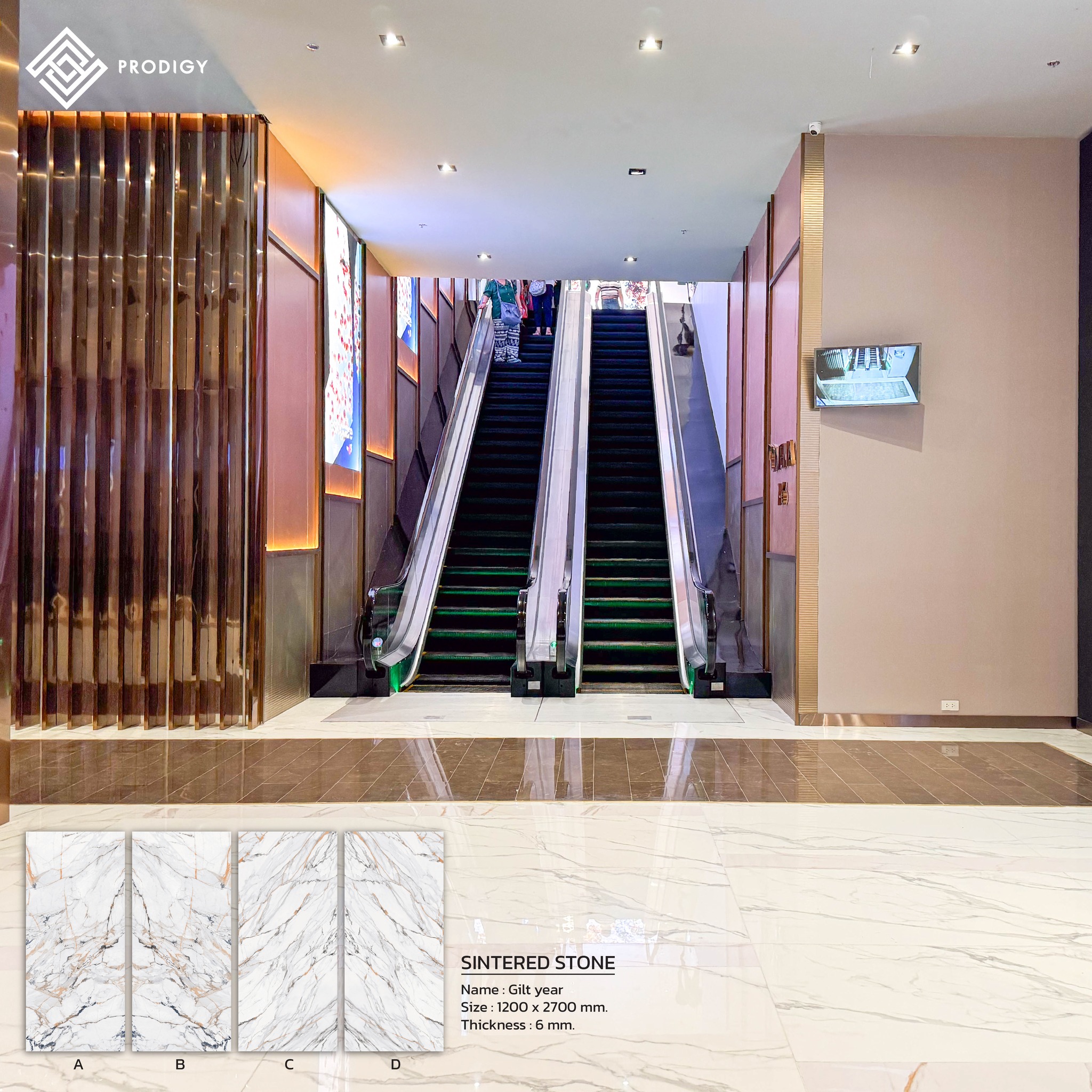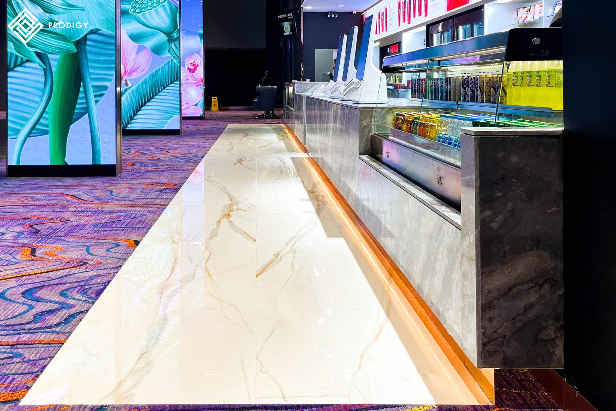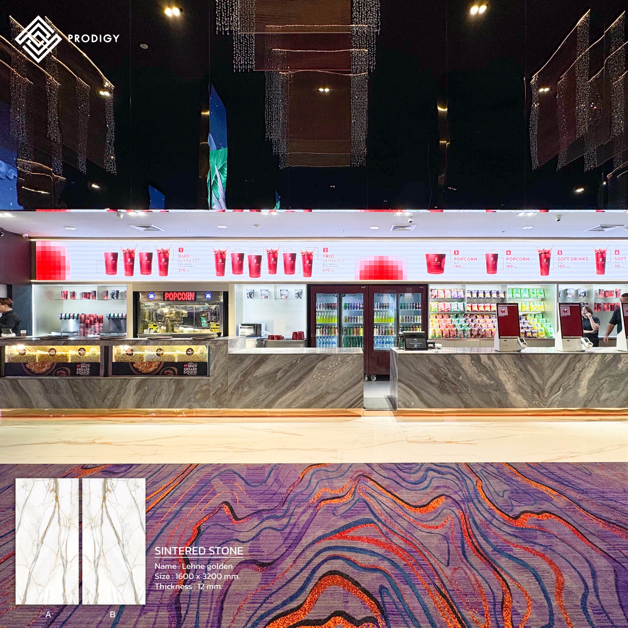 โพรดิจี้ จึงตอบโจทย์ Insight ความต้องการของลูกค้าด้วยหินสังเคราะห์ Sintered Stone ลาย Lehne Golden และ Gilt Years พร้อมด้วยหินอ่อนจาก เอส.อาร์.เอ็ม หินอ่อน ใช้งานในส่วนของพื้นทางเดินภายในโรงภาพยนตร์ ใช้งานในส่วนของพื้นและบริเวณห้องน้ำ ด้วยคุณสมบัติความแข็งแรงทนทานต่อการใช้งานที่มาพร้อมกับผิวหน้าที่มีความมันวาว จึงช่วยให้งานออกแบบมีความโดดเด่นสวยงามเข้ากันได้ดีกับบรรยากาศและการตกกระทบของแสงไฟได้อย่างลงตัว