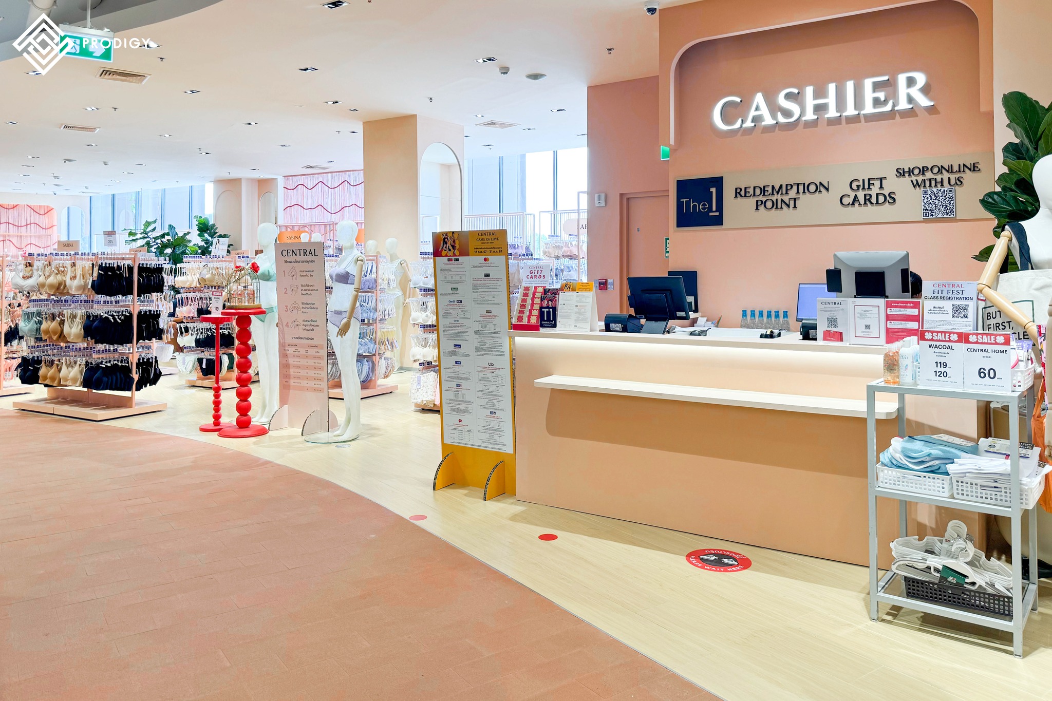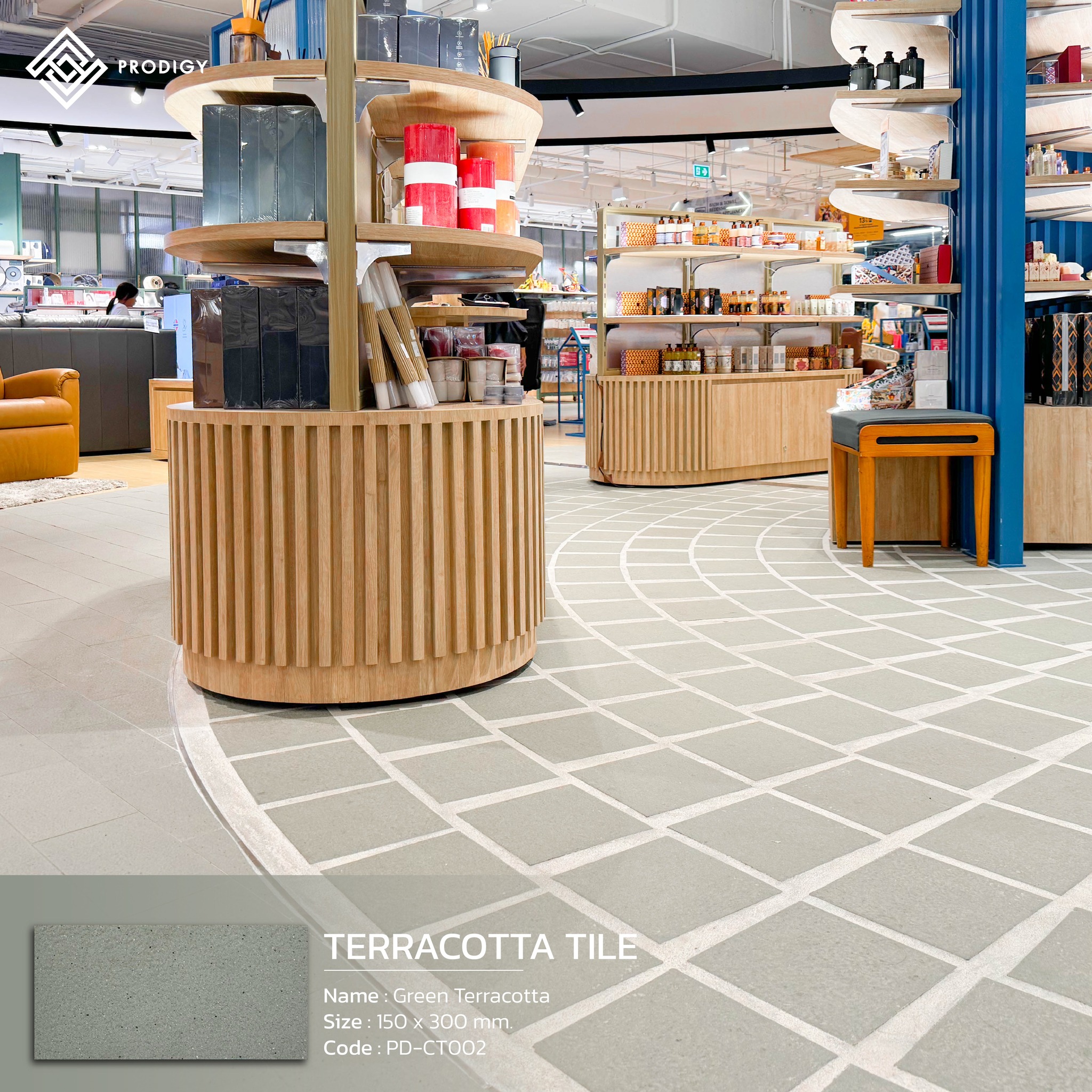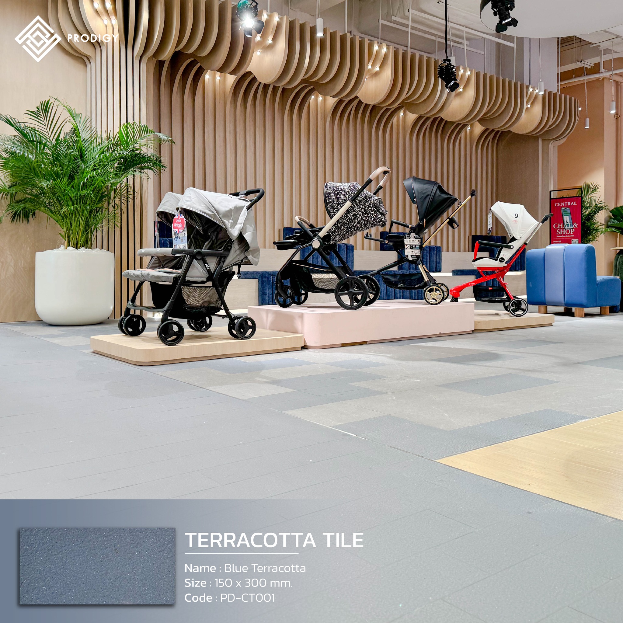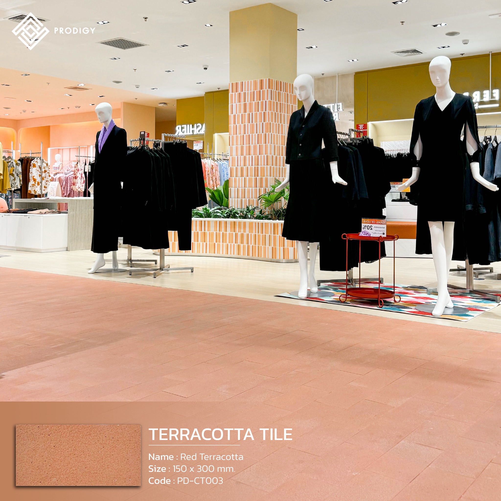 อีกหนึ่งผลงานการติดตั้งที่ภาคภูมิใจของโพรดิจี้ กับงานติดตั้งพื้นที่เดินในโซน Central Department Store ณ ศูนย์การค้า Mega Bangna โดยทางห้างเลือกใช้สินค้าของทางโพรดิจี้ สำหรับปูพื้นทางเดินสาธารณะด้วยกระเบื้องนำเข้าพิเศษรุ่น Terraccotta Tile จำนวน 3 สี ได้แก่ Blue Terracotta (PD-CT001) สำหรับโซนสินค้าเด็ก Green Terracotta (PD-CT002) สำหรับโซนสินค้าครัวและเครื่องนอน และ Red Terracotta (PD-CT003) สำหรับโซนเสื้อสตรี ด้วยคุณสมบัติของกระเบื้องที่มีความแข็งแรง ผิวหน้าระดับค่า R11 กันความลื่นได้ดี จึงเหมาะสมสำหรับการใช้งานในพื้นที่สาธารณะที่มีการใช้งานอย่างสม่ำเสมอ