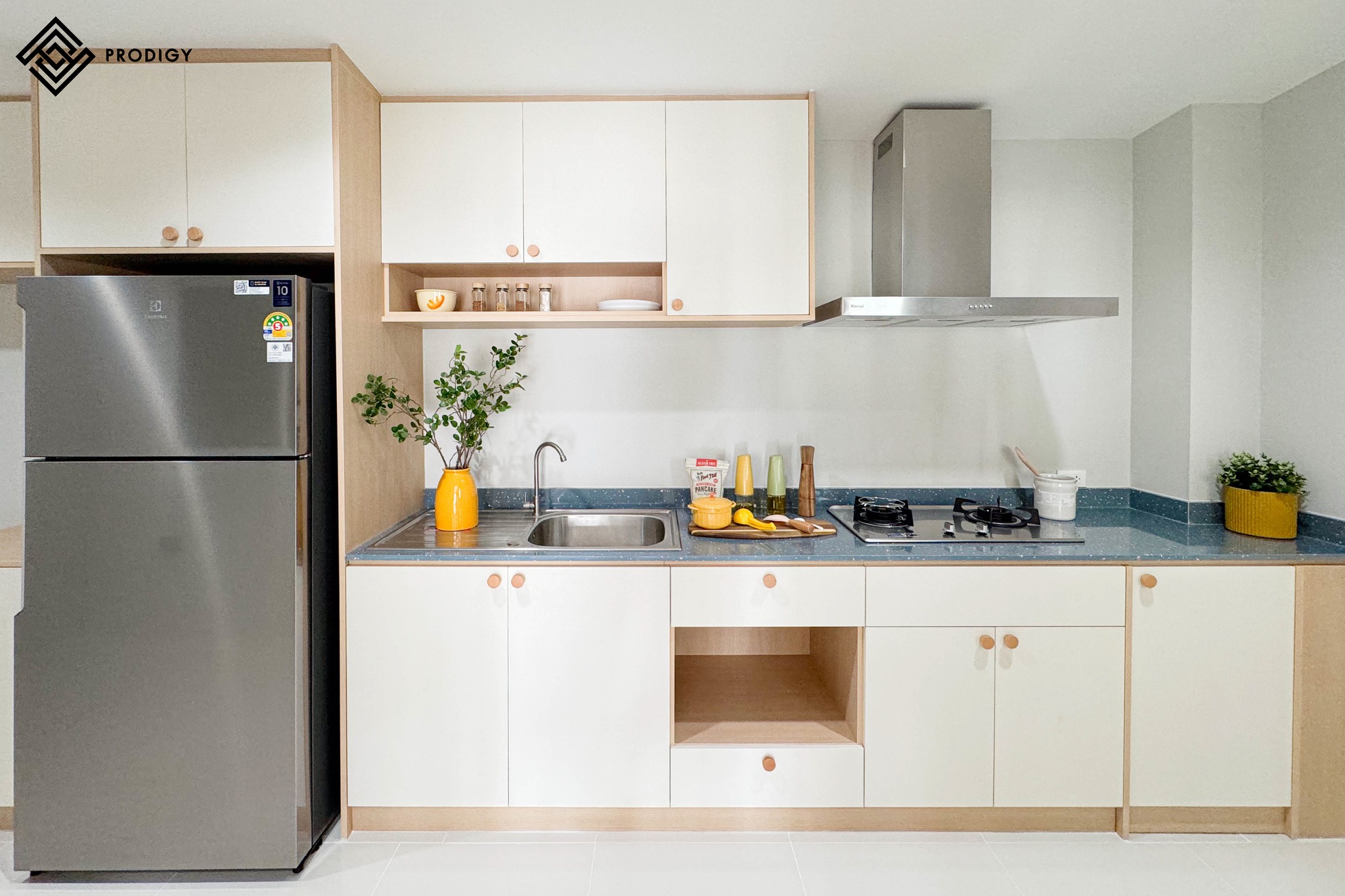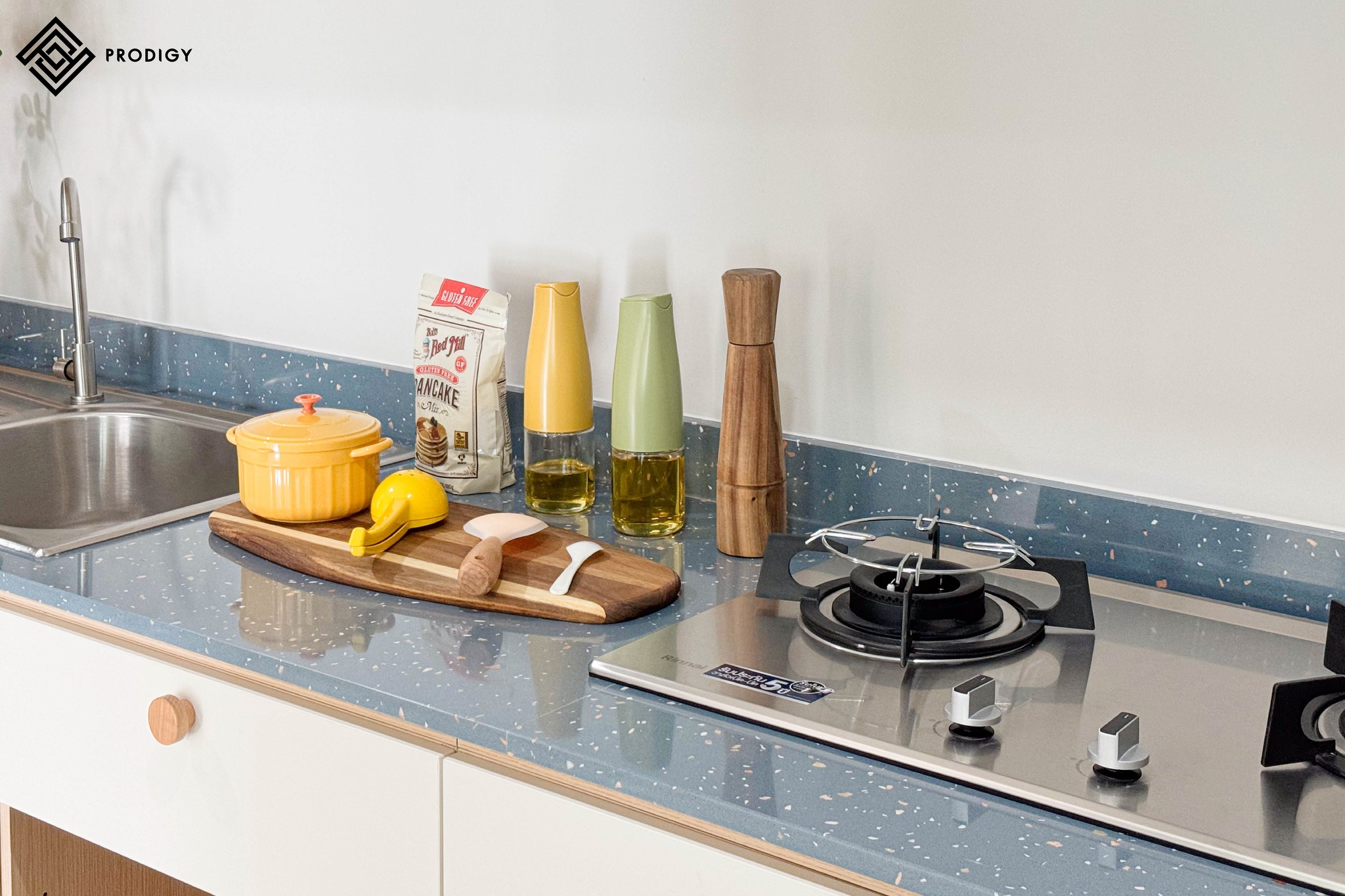 โพรดิจี้ ดีไซน์ ตอบโจทย์ Insight ความต้องการของลูกค้าด้วยหินเทอร์ราซโซลาย Celestial Blue (PD-T075) สำหรับการตกแต่งห้องครัวในบริเวณพื้นที่เตรียมอาหารและอ่างล้างจาน ด้วยพื้นหินสีฟ้าอ่อนพาสเทล มีเกล็ดหินขนาดเล็กสีเหลืองและสีขาว กระจายตัวอย่างเบาบาง เหมาะสมสำหรับลูกค้าที่ไม่ต้องการลวดลายที่โดดเด่นมากเกินไป Celestial Blue ตอบโจทย์ลูกค้าได้อย่างเหมาะสมลงตัวและยังช่วยให้งานออกแบบมีความสวยงามน่าใช้งานเป็นที่สุด